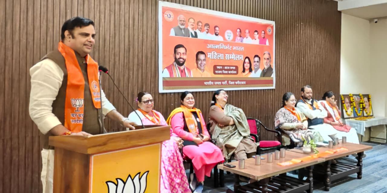 भारतीय जनता पार्टी फरीदाबाद द्वारा आत्मनिर्भर भारत अभियान के अंतर्गत एक भव्य महिला सम्मेलन का आयोजन किया गया, जिसमें जिले के विभिन्न सेल्फ हेल्प ग्रुप, एनजीओ, और सामाजिक संगठनों से जुड़ी बड़ी संख्या में महिलाओं ने उत्साहपूर्वक भाग लिया। सम्मेलन का उद्देश्य महिला शक्ति को आत्मनिर्भरता, स्वदेशी उत्पादों के संवर्धन, और राष्ट्र निर्माण से जोड़ना था। महिला सम्मलेन में जिला अध्यक्ष पंकज पूजन रामपाल, जिला प्रभारी नरेंद्र वत्स, पूर्व शिक्षा मंत्री सीमा त्रिखा, महापौर प्रवीण बत्रा जोशी, महिला मोर्चा अध्यक्ष राजबाला सरदाना, महिला मोर्चा सोशल मीडिया राष्ट्रीय संयोजिका टीना बैंटिक, आत्मनिर्भर भारत की लोकसभा संयोजिका अनीता शर्मा, जिला संयोजिका सीमा भारद्वाज मुख्य तौर पर उपस्थित रहे । इस अवसर पर उपस्थित सभी ने स्वदेशी अपनाने और स्वदेशी का प्रचार प्रसार करने की शपथ ली ।